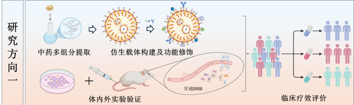 脑部疾病的治疗长期受限于血脑屏障对药物的阻隔效应及多组分协同作用的复杂性。中心聚焦中药多组分协同递送技术的创新,通过仿生载体设计突破传统递药瓶颈,以仿生囊泡、外泌体、脂蛋白纳米粒等为核心载体,结合冰片修饰、靶向肽功能化等策略,构建具有主动靶向能力的递送系统;开发“人参囊泡-溶栓纳米载体”序贯递送系统,显著提升了醒脑静注射液对缺血性脑卒中的治疗效果。在技术层面,团队攻克了仿生载体的规模化制备难题,建立了纳米粒精准组装方法,并通过活体成像技术验证了药物在脑组织的富集效果。未来,研究将深化多模态成像与智能响应技术的融合,推动中药脑靶向递送系统的临床转化。
