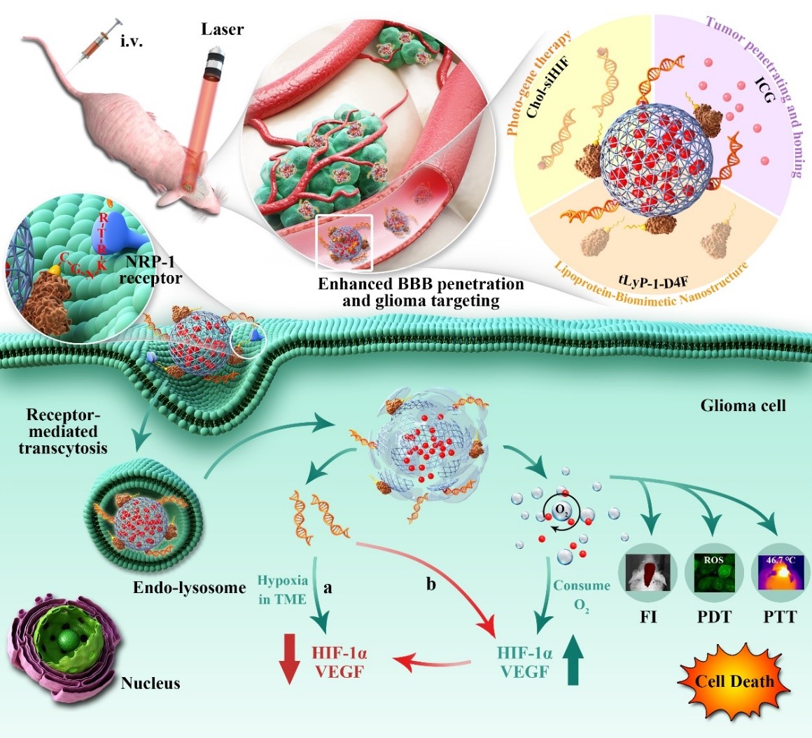 脑胶质瘤是最恶性的原发性肿瘤之一。由于血脑屏障(BBB)的存在、对化疗/放疗的耐性以及对正常脑组织不可避免的损伤,脑胶质瘤的治疗效果受到严重限制。受高密度脂蛋白(HDL)自然结构和特性的启发,该团队通过将tLyP-1与载脂蛋白A-I模拟肽(D4F)融合,构建了一种肿瘤穿透性脂蛋白,用于共递送光敏剂吲哚菁绿(ICG)和靶向HIF-1α的亲脂性小干扰RNA(siHIF),以“Lipoprotein-biomimetic nanostructure enables tumor-targeted penetration delivery for enhanced photo-gene therapy towards glioma”为题发表于Bioactive Materials上。所设计的脂蛋白仿生纳米粒可最大限度地发挥多种诊疗方式的协同作用,为精确肿瘤定位和胶质瘤的早期诊断、靶向、长效和联合治疗提供了有效的策略(Fig.1)。