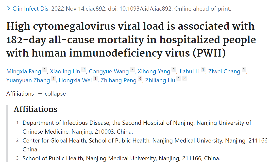 2022年11月,betway西汉姆联官网附属南京医院(南京市第二医院)胡志亮教授团队联合南京医科大学公共卫生学院彭志行教授团队在国际权威期刊《Clinical Infectious Diseases》(中科院1区,IF:20.999)上在线发表了题为“High cytomegalovirus viral load is associated with 182-day all-cause mortality in hospitalized people with human immunodeficiency virus (PWH)”的研究论文。betway西汉姆联官网附属南京医院感染科方明霞副主任医师、南京医科大学公共卫生学院硕士生林晓玲和王琮越为本论文的共同第一作者,betway西汉姆联官网附属南京医院感染科胡志亮主任医师和南京医科大学公共卫生学院彭志行教授为共同通讯作者。