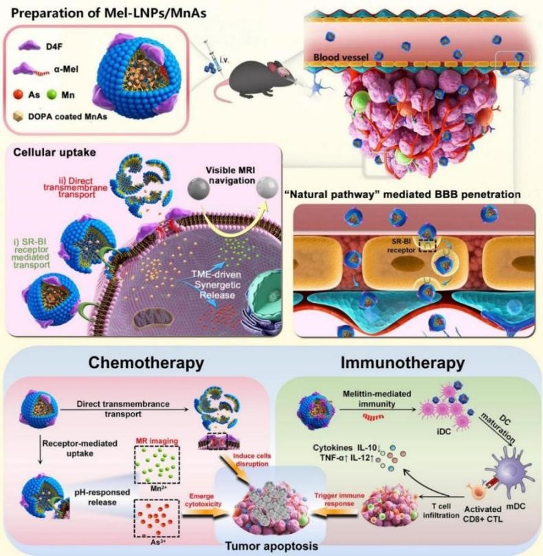 胶质母细胞瘤以其高致死率及高复发率成为最恶性的脑胶质瘤,由于血脑屏障的存在、高度干性表达、单一化疗模式易产生耐药性,其治疗效果受到严重制约。受高密度脂蛋白结构与功能的启发,基于前期工作基础(Bioactive Materials. 2022;Theranostics. 2022;Nano Research. 2022;Biomaterials. 2019;Small.2018.),团队将免疫激活蜂毒肽Mel与载脂蛋白A-I模拟肽融合,成功构建出功能化脂蛋白仿生递送平台,用于共递送中药活性成分三氧化二砷(ATO)和核磁共振成像造影剂锰(Mn),以“Bio-fabricated nanodrugs with chemo-immunotherapy to inhibit glioma proliferation and recurrence”为题发表于Journal of Controlled Release上。该纳米药物巧妙的将化疗与免疫治疗相结合,同时通过下调胶质瘤细胞干性抑制其复发,成功构建出精准高效“诊疗一体化”纳米药物平台,实现了中药复方的协同治疗,解决了传统中药治疗机制单一、病灶部位靶向性差的问题,为抑制脑胶质瘤的增殖与复发提供了模板(Fig. 1)。