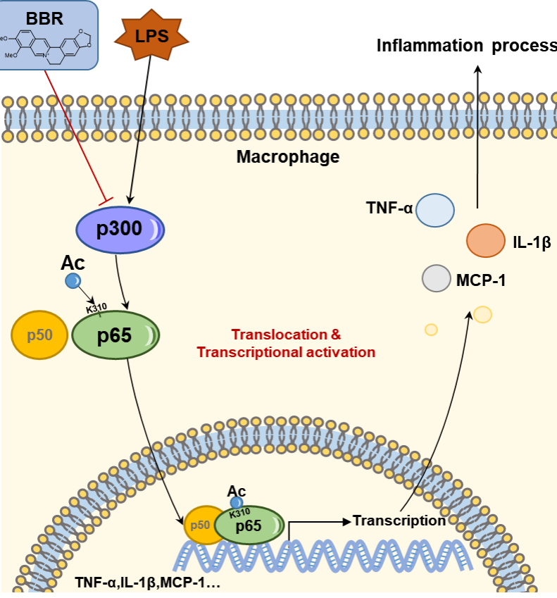 中药黄连活性成分小檗碱在临床上被广泛用于治疗炎症相关性疾病,然而小檗碱的临床抗炎原理一直没有得到明确的阐释。该研究通过蛋白质组学及表观遗传学分析技术,首次发现小檗碱改变LPS诱导的巨噬细胞蛋白质乙酰化。通过体内外模型研究发现,小檗碱主要通过减少NF-κB亚单位p65在赖氨酸310位点(p65Lys310)的乙酰化,导致NF-κB转位和转录活性受到抑制,从而抑制炎症因子的表达。进一步研究发现,小檗碱抑制p300在巨噬细胞中的表达,从而抑制p65Lys310的乙酰化,并在急性炎症和慢性炎症肥胖小鼠模型中加以验证。该研究系统地阐明小檗碱通过直接抑制p300/p65Lys310轴发挥抗炎作用的新分子机制,为小檗碱后续的临床炎症相关的疾病治疗机制和临床应用提供重要药理学依据。