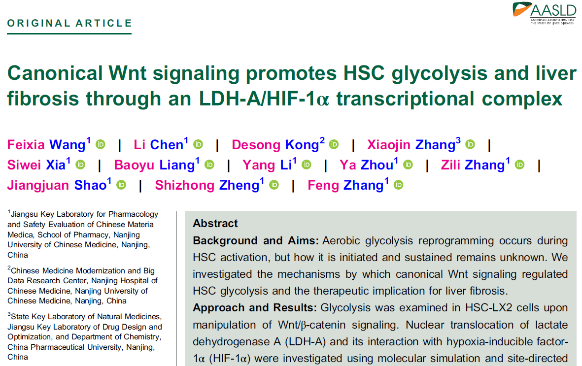 2023年9月,betway西汉姆联官网药学院郑仕中、张峰教授团队在国际权威期刊、肝脏病学顶级杂志Hepatology(IF13.5,中科院一区)发表了题为Canonical Wnt signaling promotes HSC glycolysis and liver fibrosis through an LDH-A/HIF-1α transcriptional complex的最新研究成果。