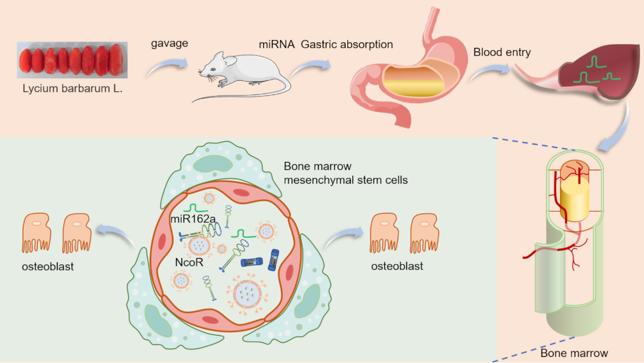 历代医典均记载中药枸杞具有“补肾壮骨”的独特功效,但现代科学研究尚未发现枸杞“补肾壮骨”独特功效物质。该研究首次发现来源于枸杞的全新核酸类功效物质miR162a,能够直接被哺乳动物消化道吸收并通过血液循环进入各个器官,通过“跨界调控”的形式,直接靶向哺乳动物骨髓间充质干细胞,促进骨髓间充质干细胞分化为成骨细胞,促进骨细胞生长,治疗骨质疏松。该研究从现代医学的角度阐释枸杞补肾壮骨的科学内涵,在防治骨质疏松症方面取得了极佳效果,验证了中医对骨质疏松病机的科学解释。鉴于枸杞中miR162a的丰度相对较低,该研究还开发了转基因本氏烟叶进行过表达miR162a,这是植物科学中应用最为广泛的实验模型之一。转基因本氏烟叶不仅能实现miR162a的量产,还可以有效预防小鼠骨质疏松症。基于产量高、成本低、环境适应性强的特性,利用转基因植物生产miRNA实现疾病治疗可能具有广阔的应用前景和市场价值。