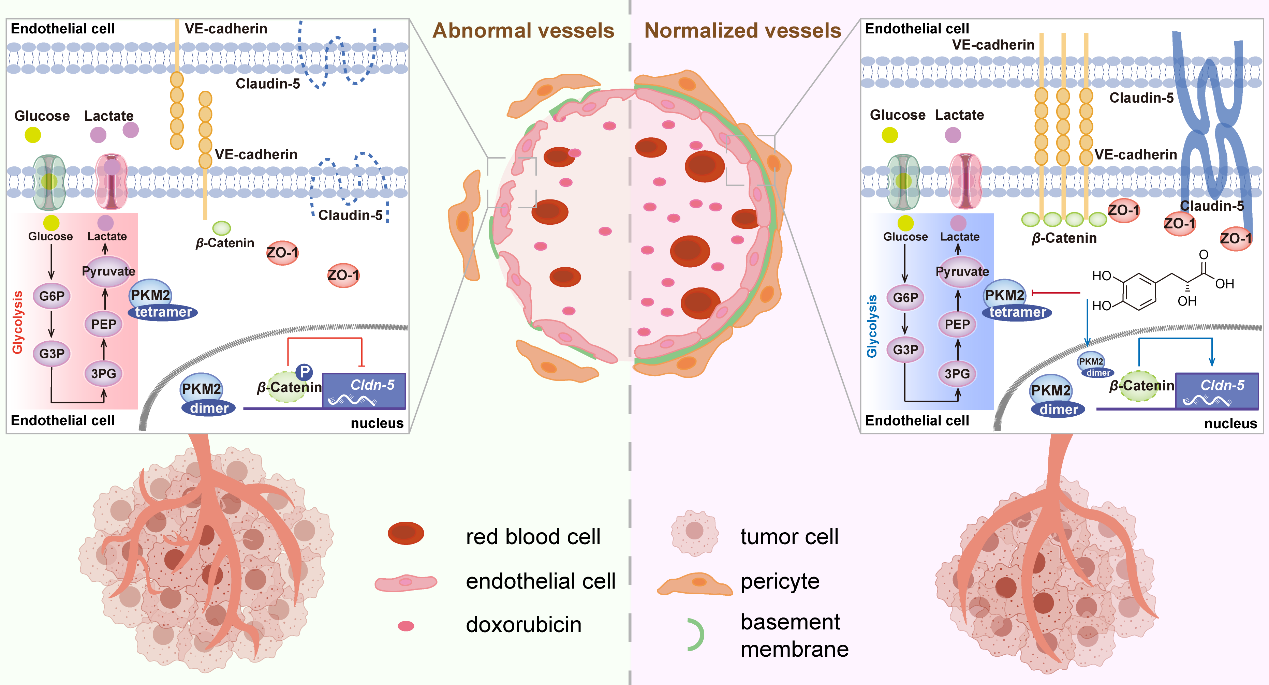 肿瘤血管的结构和功能异常是实体瘤的重要标志。异常的肿瘤血管不仅促进肿瘤的进展,而且阻止抗肿瘤药物在瘤内的递送。因此,发现肿瘤内皮细胞代谢异常的关键靶标及相关治疗药物已成为迫切需要,并对临床抗肿瘤联合治疗具有重大意义。该研究发现活血化瘀中药丹参主要活性成分丹参素在影响肿瘤血管方面发挥关键作用。丹参素通过调控关键激酶PKM2抑制内皮细胞糖代谢,并通过β-Catenin/Claudin-5信号级联增强内皮细胞间紧密连接。丹参素通过纠正肿瘤血管异常的结构和功能,以促进化疗药物在瘤内的分布与含量。此研究揭示丹参素可作为肿瘤血管正常化的有效药物并为肿瘤联合治疗提供潜在选择。