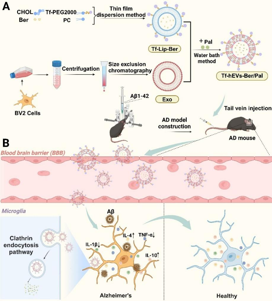课题组在黄连解毒汤抗阿尔茨海默病(AD)效应及机制的长期研究中,发现复方中主要活性成分小檗碱(Ber)和巴马汀(Pal)具有调控小胶质细胞表型极化的协同作用,并通过抑制神经炎症改善AD病理进程。然而,血脑屏障(BBB)的存在导致上述成分的脑部递送效率不足。研究通过融合小胶质细胞来源的外泌体(Exos)与脂质体(Lips),并利用转铁蛋白(Tf)修饰构建了兼具BBB跨越与小胶质细胞靶向的杂化纳米囊泡体系(Tf-hEVs-Ber/Pal),进一步提升了Ber和Pal 的BBB穿透能力,靶向作用于小胶质细胞,并有效改善AD模型小鼠的认知功能障碍与行为学。论文研究结果为中药活性成分的协同脑靶向递送提供了新型策略。