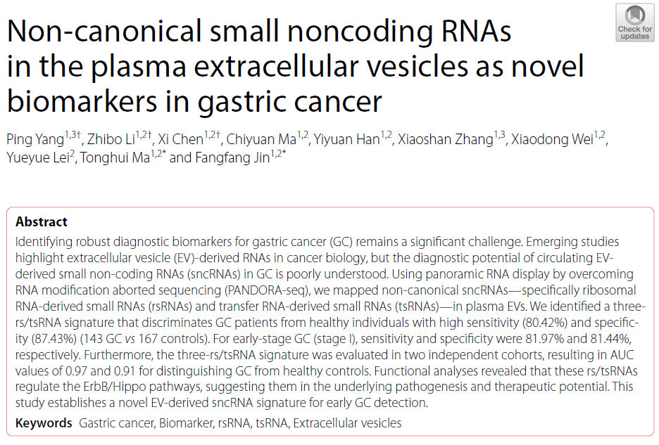 2025年4月3日,国际知名学术期刊Journal of Hematology & Oncology(中科院医学一区,IF=29.9)在线发表了我校麻彤辉教授、金芳芳副教授团队的最新研究成果:Non-canonical small noncoding RNAs in the plasma extracellular vesicles as novel biomarkers in gastric cancer。
