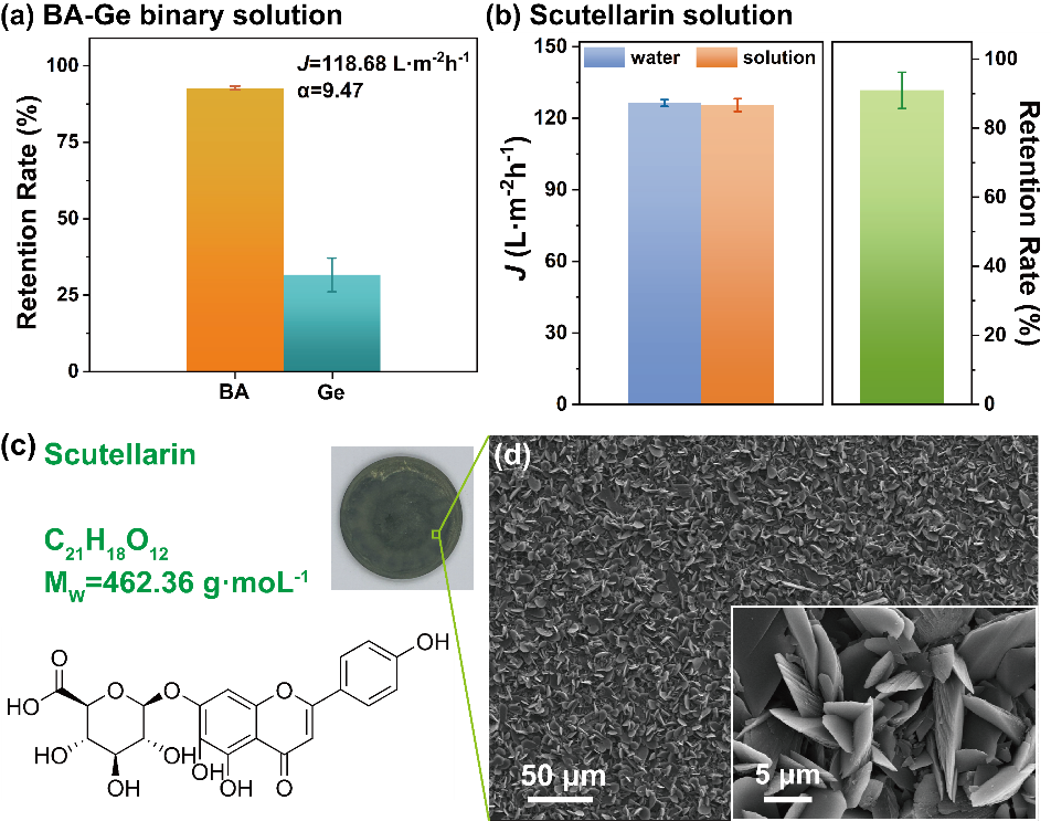 图3. H-C@AC 膜对黄芩苷和栀子苷的膜分离性能(a)和对结构相似的灯盏乙素的膜分离结果(b-d)