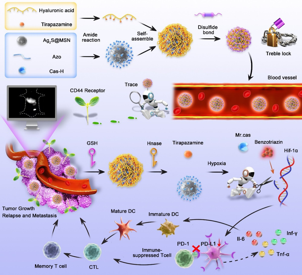 该研究开发了一种“三锁”多功能纳米药物载体(AA@Cas-H@HTS),依次响应肿瘤微环境中的谷胱甘肽(GSH)、透明质酸酶(HAase)和乏氧信号(Hypoxia),从而实现基因编辑大分子药物与化疗小分子前药的精准可控激活。首先合成的AA@Cas-H@HTS具有核壳结构,二氧化硅涂层的硫化银量子点(Ag2S@SiO2)作为载体通过偶氮键连接CRISPR-Cas9 RNP系统,形成第一层防御外壳(AA@Cas-H);其次,利用疏水前药TPZ和亲水透明质酸(HA)偶联制备TPZ修饰的透明质酸聚合物(HT),通过自组装作用将基因编辑大分子药物封装在HT中,形成第二层防御外壳(AA@Cas-H@HT);最后,利用二硫化物进一步交联HT形成第三层防御外壳(AA@Cas-H@HTS)。实验结果表明,HTS纳米药物载体具备良好的长血液循环能力、特异的肿瘤靶向能力以及优良的NIR-II近红外二区成像能力。通过CRISPR-Cas9介导的HIF-1α敲低和乏氧激活前药TPZ协同作用,有效抑制PD-1/PD-L1通路改善肿瘤免疫抑制性微环境,为实现个性化的肿瘤精准治疗和诊疗一体化提供了新的技术方法和策略。