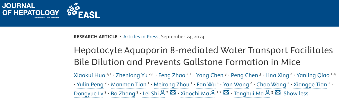 2024年9月24日,我校药学院麻彤辉教授课题组与大连医科大学马骁驰教授课题组在肝脏研究领域顶刊Journal of Hepatology(IF=26.8)在线发表题为“Hepatocyte Aquaporin 8-mediated Water Transport Facilitates Bile Dilution and Prevents Gallstone Formation in Mice”的研究论文,该研究发现肝细胞毛细胆管膜水通道蛋白AQP8高效介导水转运的分子机制,可促进小鼠胆汁稀释和防止胆结石形成;通过构建AQP8调控的高通量筛选体系,对中医治疗胆结石的20种常用“利胆”中药进行筛选,从中药灯盏细辛中分离出药效活性小分子-野黄芩苷(Scutellarin)。体外研究表明,野黄芩苷显著上调原代培养肝细胞AQP8 mRNA和蛋白表达。体内研究显示野黄芩苷显著增加胆汁流量,降低胆汁中胆固醇、胆汁酸和磷脂等脂质浓度,并阻止高脂饲料诱导的胆固醇结石形成,而对AQP8-/-小鼠无明显影响。分子机制研究表明,野黄芩苷通过抑制AQP8的转录负调控因子HIF-1α与HSP90的相互作用,促进了HIF-1α的泛素化降解,从而上调AQP8基因表达,促进胆汁分泌,发挥利胆作用。