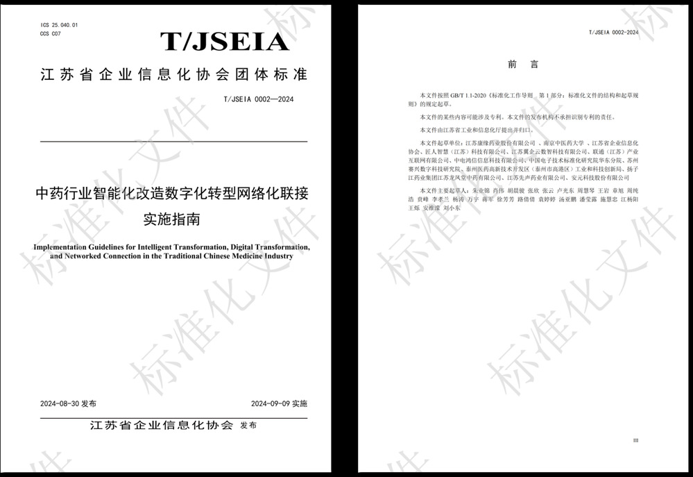 2024年9月9日,由betway西汉姆联官网、江苏康缘药业股份有限公司组织编制的《江苏省中药行业智能化改造数字化转型网络化联接实施指南》团体标准正式对外发布。该指南是我国中药制药过程控制与智能制造技术领域首部“智改数转网联”的团体标准,面向解决中药行业生产制造工艺落后、信息基础设施薄弱、安全质量监管困难等行业痛点,从智能化基础支撑、企业关键环节建设管理出发,全面实现企业智能装备、过程控制系统、状态监测系统、生产、经营管理等系统的数据互通、数据互融和业务协同,促进企业生产管控一体化。依托数字化、网络化、智能化能力,保障数据安全、网络安全、工控安全,实现中药企业数字化设计建设、中药行业产业链上下游、中药企业与管理部门以及服务部门的高效联接协同发展,全面提升中药行业高质量发展能力和水平。
