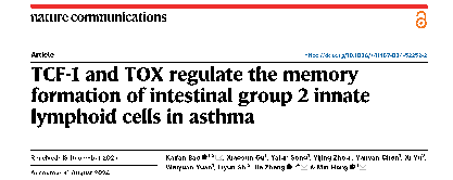 2024年9月8日,国际期刊Nature Communications(中科院综合性期刊1区Top,IF:14.7)在线发表我校药学院洪敏教授、医学院青年教师包凯帆、郑劼副教授团队论文:TCF-1 and TOX Regulate the Memory Formation of Intestinal Group 2 Innate Lymphoid Cells in Asthma。该研究发现了一种具备免疫记忆样功能的2型固有淋巴细胞(memory-like group 2 innate lymphoid cells, ml-ILC2s)的新亚型,ml-ILC2s的“肺肠”间迁移在哮喘反复发作中扮演的关键角色,转录因子TCF-1和TOX与其记忆形成及体内迁移密切相关。