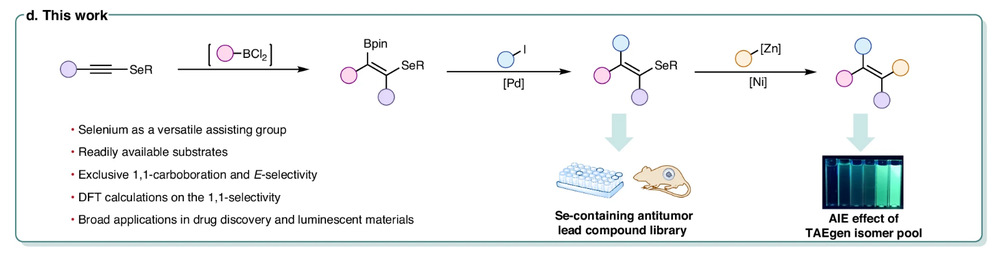 富硒中药材因硒元素独特的化学和生理活性,在抗肿瘤、抗氧化等方面展现出显著优势。金弘明教授团队联合沈旭教授团队通过设计开发一种硒炔协二加成策略,成功构筑了一系列结构新颖的含硒四取代烯烃化合物,通过系统的体外和体内抗肿瘤活性评价,证明了硒元素的引入可显著提升原先药物的抗肿瘤活性并降低对正常细胞的毒性。