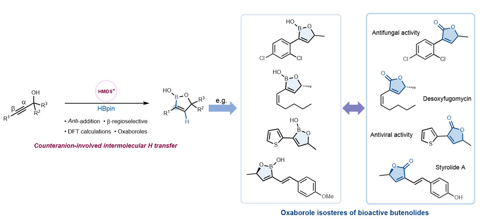 硼砂作为一种中药材具有抗菌、消炎和抗肿瘤的功效。此外硼元素在硼中子俘获治疗中也发挥重要作用。金弘明教授团队通过发展炔烃反式硼氢化策略,高效构建了一类丁烯酸内脂的含硼生物电子等排体,通过对原先生物活性分子中羰基的电子等排替换,为含硼药物分子的设计开发提供了新的思路。
