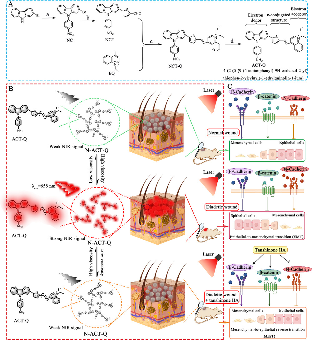 近日,我校朱栋教授课题组在国际知名期刊Chemical Engineering Journal(中科院一区,IF:13.4)发表题为“Viscosity-activated reversible fluorescent probe for monitoring the diabetic refractory wound microenvironment”的研究性论文,为“血瘀”高粘度微环境定量监测提供新策略。