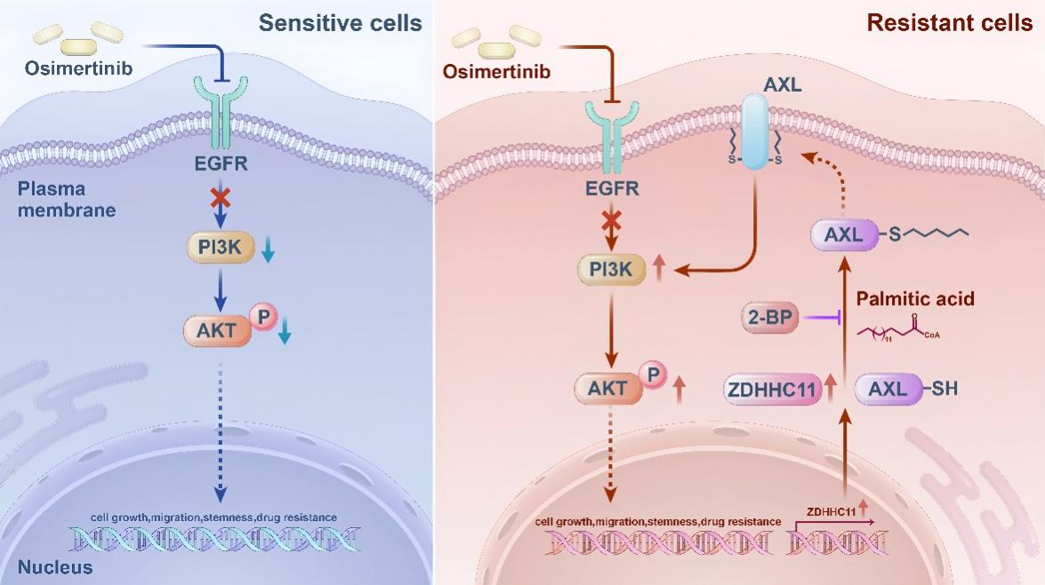 奥希替尼耐药是临床治疗EGFR突变型非小细胞肺癌患者亟待解决的问题。该研究揭示了棕榈酰化修饰相关酶ZDHHC11介导的AXL蛋白棕榈酰化在奥希替尼耐药中的作用机制,将ZDHHC11确立为潜在治疗靶点,通过靶向ZDHHC11可增强非小细胞肺癌患者对奥希替尼的治疗反应,为克服靶向治疗耐药提供了新策略,也丰富了对酪氨酸激酶抑制剂抗肿瘤疗效机理的认识。