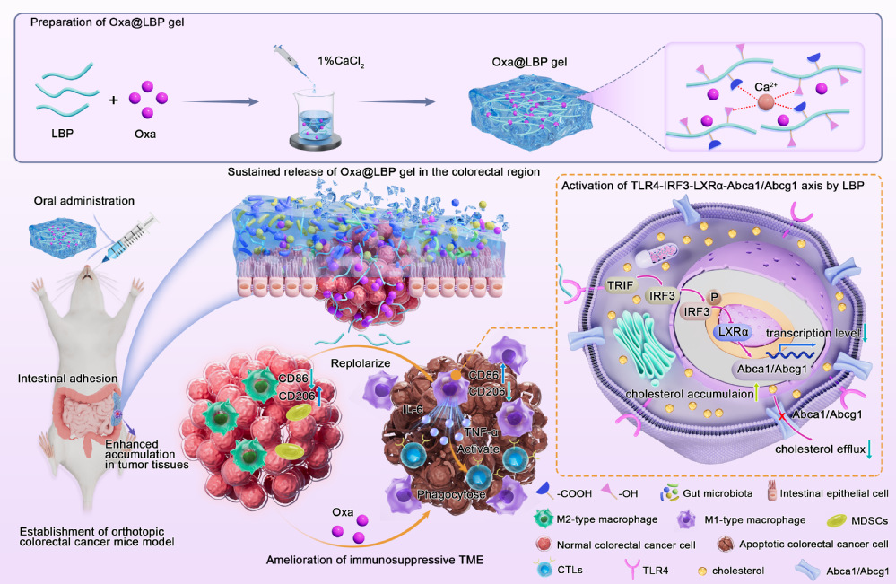 2026年1月7日,段金廒、韩欣、包纯洁、段嘉伦等人在国际学术期刊Advanced Functional Materials(中科院一区,IF:19.0)期刊上在线发表了题为Lycium Barbarum Polysaccharide-based Hydrogel as a Novel Oral Colon-Targeted Drug Delivery System for Enhanced MSS-CRC Treatment by Macrophage Lipid Reprogramming的研究工作。研究创新性地提出以枸杞子多糖作为生物活性基质,构建了一种口服结肠靶向水凝胶递药系统,用于提升MSS型结直肠癌的治疗效果。实验表明,该凝胶系统能够实现化疗药物奥沙利铂在结肠部位的可控缓释,增强药物在肿瘤组织的富集,同时减少其进入全身循环,从而显著降低毒副作用。进一步的机制研究表明,枸杞子多糖可通过调控TLR4-IRF3-LXRα-Abca1/Abcg1信号轴,重编程肿瘤相关巨噬细胞的脂质代谢,促进其向M1抗肿瘤表型极化,进而重塑免疫抑制性肿瘤微环境,增强化疗敏感性。该工作为基于中药活性成分开发兼具生物学功能与递药能力的新型生物材料提供了新范式,不仅拓展了中药现代化应用的路径,也为实现肿瘤治疗的“增效减毒”的目标提供了具有高转化潜力的新策略。